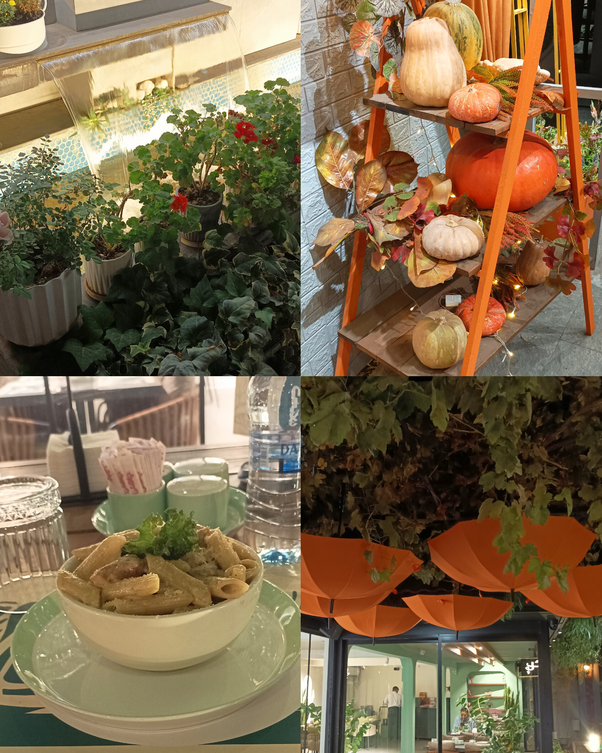 یه برگ آلوورا گذاشتم رو صورتم، التهاب کم شد، بعدش پماد زینک زدم و خدا رو شکر صورتم به حالت قبل برگشت^^ سریع آماده شدم که بریم رستوران. اولش قرار بود بریم رستورانی که تم هالووینی داره🎃ولی بعد متوجه شدیم رستورانای این چنینی رو پلمپ کردن، وقتی رسیدیم رستورانه بسته بود. کنارش یه رستوران دیگه بود رفتیم اونجا. جای شیک و قشنگی بود. پرسنل هم خیلی خوش برخورد بودن. رفتیم تو فضای باز نشستیم و پاستا آلفردو سفارش دادیم. اولین بار بود که میخوردم، طعم خوبی داشت. خدا رو شکر این پاییز همش مشغول سفر و گشت و گذارم^^مشهد رفتم، یه دفعه با دوستم رفتم پارک و کافه، یه دفعه با زن داداشم رفتم مرکز خرید، امشب هم که با داداشم رفتم رستوران^^